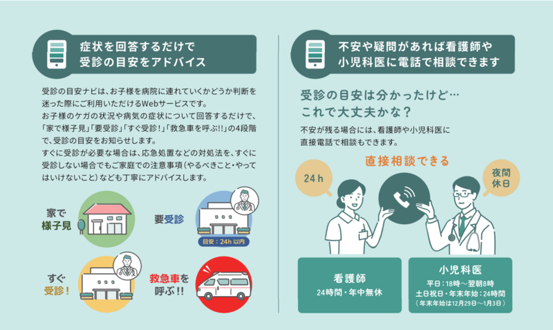 ・ 当てはまる症状がない場合や判定結果に不安がある場合は、看護師や小児科医に電話で相談ができます。(WEB入力した内容は相談先に共有されるため、スムーズに相談できます)
