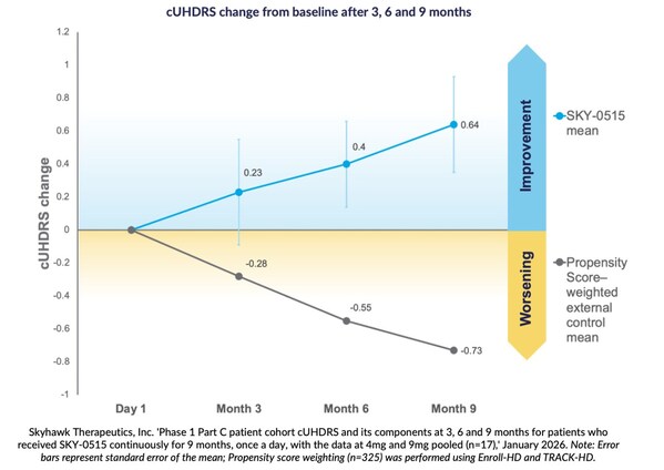 At three, six and nine months, patients receiving SKY-0515 in the Part C patient cohort of the Phase 1 clinical trial of SKY-0515, demonstrate mean Composite Unified Huntington's Disease Rating Scale (cUHDRS) improvement from baseline. At nine months, in a pooled analysis, this improvement is +0.64 points compared to expected worsening at nine months of cUHDRS in symptomatic patients of -0.73 points, based on propensity score weighting using Enroll-HD and TRACK-HD.