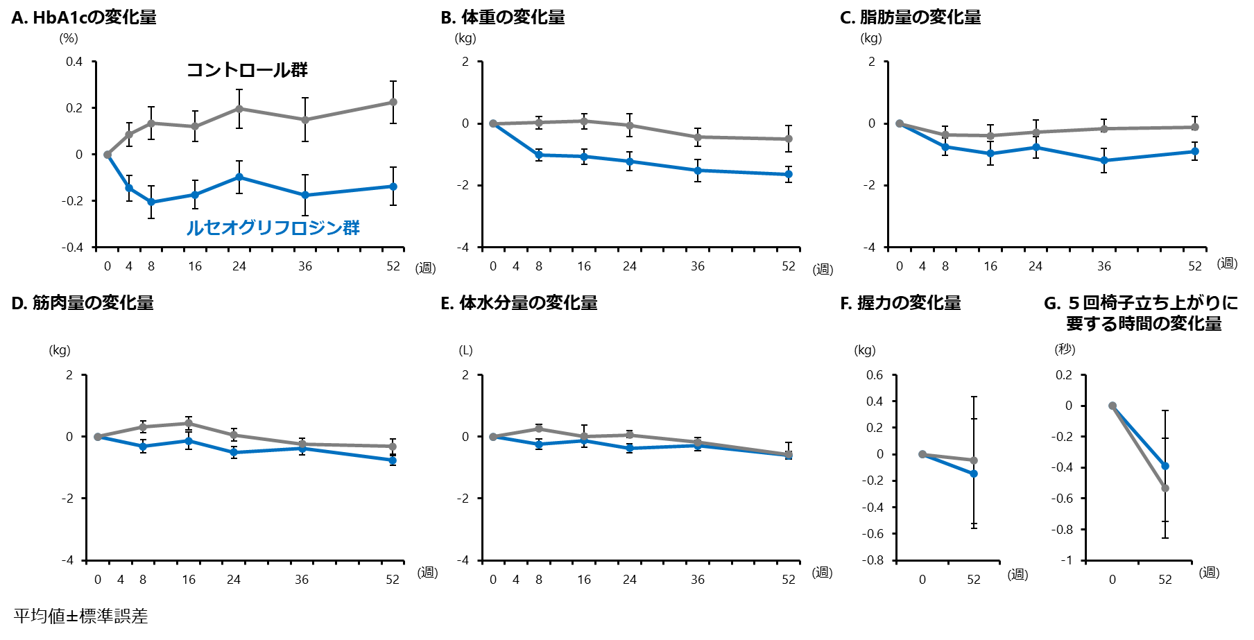 その結果、ルセオグリフロジン群では、コントロール群と比較して、血糖管理指標であるHbA1cが平均0.36%改善し、体重も平均1.15kg減少しました。一方、SMI(骨格筋量指数)*4、握力、5回椅子立ち上がり時間などには両群で差はなく、筋肉量や筋力、身体機能への悪影響は認められませんでした。また、重症低血糖や脱水、ケトアシドーシスなどの重大な副作用も確認されませんでした。