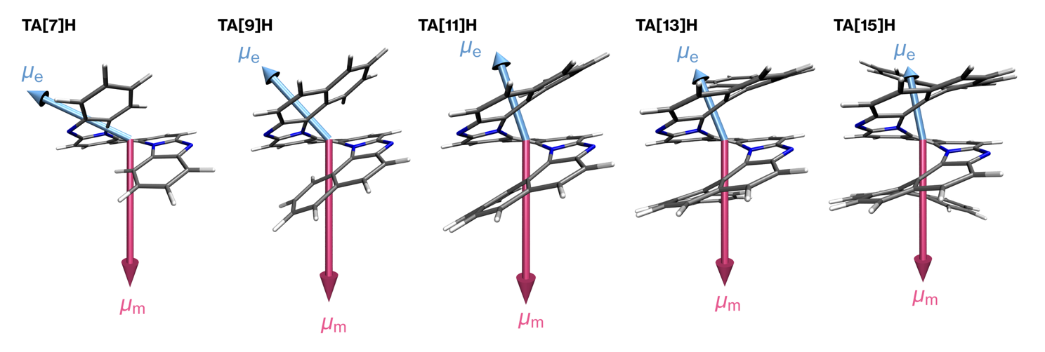 分子が長くなるにつれて、電気遷移双極子モーメント(μₑ)と磁気遷移双極子モーメント(μₘ)の相対配向が整い、円偏光発光に有利な条件が形成されることを示している。