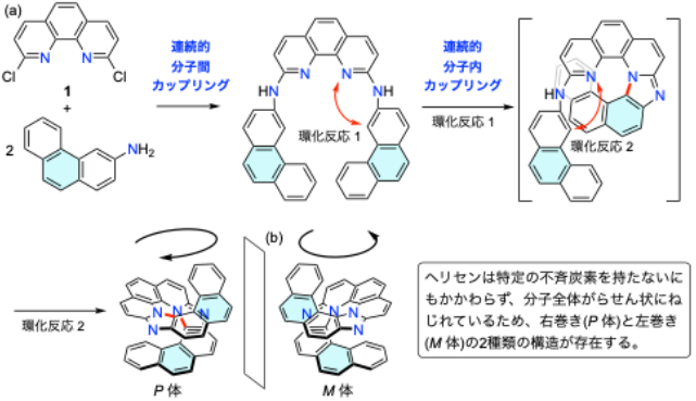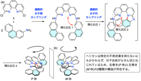 図1.(a) テトラアザ[11]ヘリセンを例とした本研究で開発した2段階合成法と(b)ヘリセンの鏡像異性体の構造