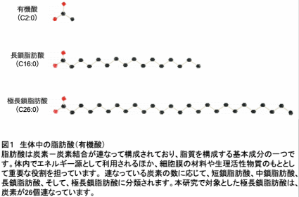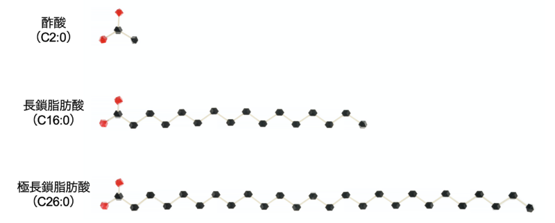 生体には、様々な種類の脂肪酸が存在します。中でも、炭素がとても長くつながった脂肪酸は極長鎖脂肪酸とよばれます(図1)。