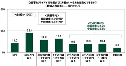 職業別にみると、会社員では9万円の増加(前回調査122万円→今回調査131万円)、学生では3万円の増加(前回調査24万円→今回調査27万円)となったのに対し、パート・アルバイトでは8万円の減少(前回調査45万円→今回調査37万円)となりました。