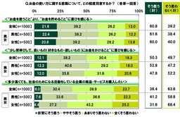 全回答者(1,000名)に、お金の使い方に関する意識について、どの程度同意するか聞いたところ、<“お金を使うこと”より、“お金を貯めること”に喜びを感じる>では「非常にそう思う」が21.6%、「ややそう思う」が39.2%で合計した『そう思う(計)』は60.8%となりました。また、<“少し背伸びして、良いもの(好きなもの・欲しいもの)にお金をかけること”に喜びを感じる>では『そう思う(計)』は50.3%、<多少高くても、社会のためになる活動をしている企業の商品・サービスを購入したい>では『そう思う(計)』は36.4%となりました。