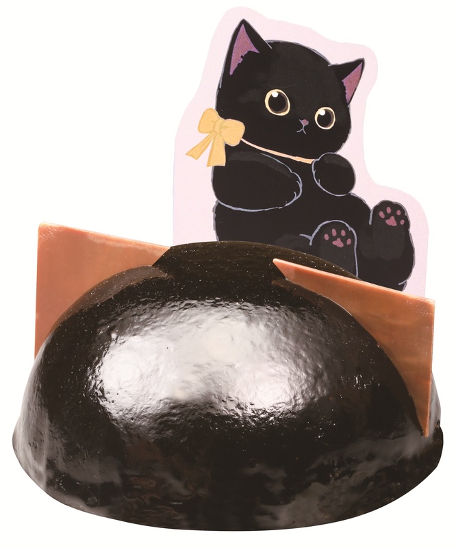 mofusandのキャラクター“くろにゃん”をイメージした商品。サクサク食感のクランブルの上にキャラメルムースがあり、表面はショコラでコーティングしたドーム型ケーキです。ケーキに三角のチョコをトッピングすることで、猫の形を再現しました。