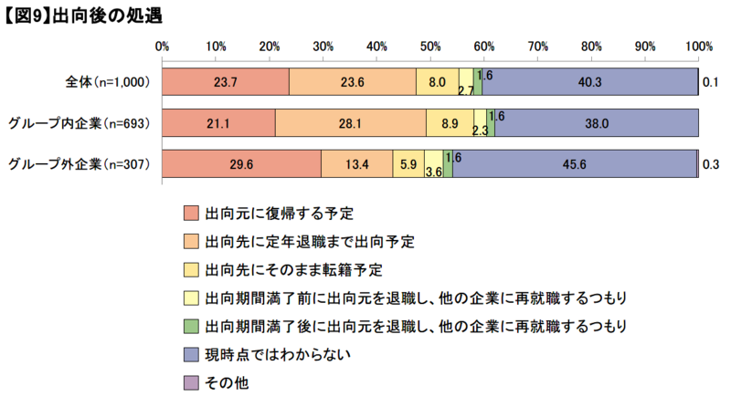 また、「現時点ではわからない」と回答した者を出向先企業のグループ内・外別に見ると、グループ内企業では38.0%、グループ外企業で45.6%となり、グループ外企業への出向では、出向期間満了後の処遇が未定となっている者の割合が多いことが分かった。【図9】