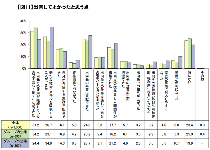 出向してよかったと思う点(複数回答)では、「出向元での雇用が継続しているので不安なく働くことができた」が全体の31.2%で最多。出向先企業のグループ内・外別に見ると、グループ外企業への出向では、「新たな技術・スキルを吸収することができた」(34.9%)が最多、「出向先の事業に貢献できた」(27.7%)と続き、出向先企業でのスキル習得や事業貢献を評価している者の割合が高いことが分かった。