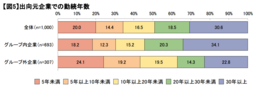 出向先企業のグループ内・外別に見ると、グループ内企業への出向した者のうち、勤続30年以上と回答した者の割合が34.1%、グループ外企業では22.8%と差異が見られた。【図5】