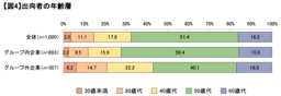 出向先企業のグループ内・外別に見ると、グループ内企業への出向者は50歳代及び60歳代が7割強を占めるのに対して、グループ外企業では50歳代及び60歳代が6割未満となっており、グループ内企業への出向は、シニア層の割合が大きくなる傾向が見られた。【図4】