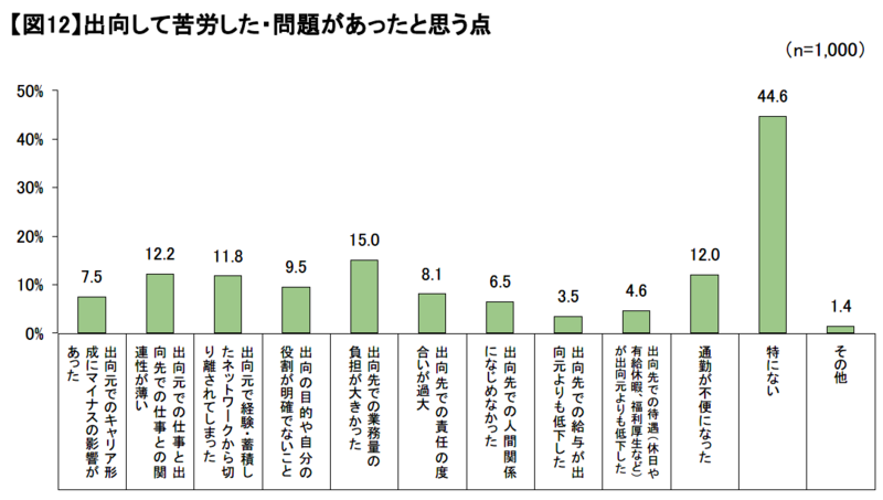 次に、出向して苦労した、または問題があったと思う点(複数回答)として、「特にない」(446人、44.6%)を除くと、「出向先での業務量の負担が大きかった」(150人、15.0%)が最多、「出向元での仕事と出向先での仕事との関連性が薄い」(122人、12.2%)、「通勤が不便になった」(120人、12.0%)と続いた。【図12】