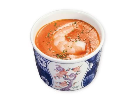 えびクリームソースは、細かく砕いた甘えびの頭を原料に使用し、完熟トマト、北海道産生クリーム、牛乳などをブレンド。エビの風味が香る、コクがあり深みのあるソースになっています。出汁の味わいが楽しめる特製茶碗蒸しにも、えびクリームソースにも相性の良い、ボイルされたエビとパセリをトッピングすることで、全体が調和するよう仕上げました。