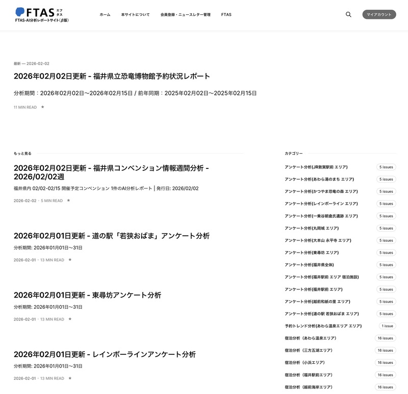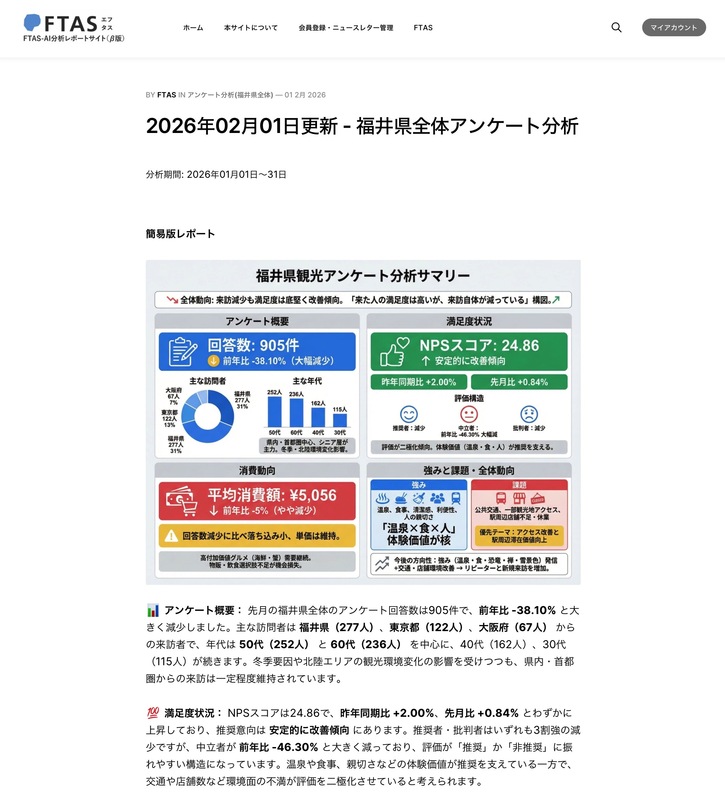福井県観光DXコンソーシアムでは、FTASを通じて蓄積してきた観光データを、いかに現場で「使われる形」にするかを重視してきました。今回のbasicmath社が取り組む生成AIを活用した分析レポートの提供は、分析作業を数時間から数分へと大幅に短縮し、観光事業者や地域が“今何が起きているのか”を即座に共有できるもので、更にはFTASのサイトにアクセスせずとも、生成AIによる分析結果をメールで受け取れる点に大きな価値があります。データ駆動型の経営を地域に浸透させるための大きな一歩であると確信しています。