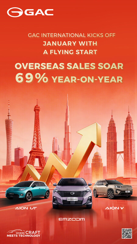 中国・広州市、2026年2月3日 /PRNewswire/ -- 2026年の幕開けとともに、 GACは「好調なスタート」を切り、業界をリードしています。今年1月、同社の海外卸売販売台数は前年同月比69%増となり、過去2年間の力強い成長の勢いを維持し、2026年の海外販売目標「30万台」に向けて確固たる基盤を築きました。なかでもAION Vは、海外発売以来で最多となる月次小売販売台数を記録しました。