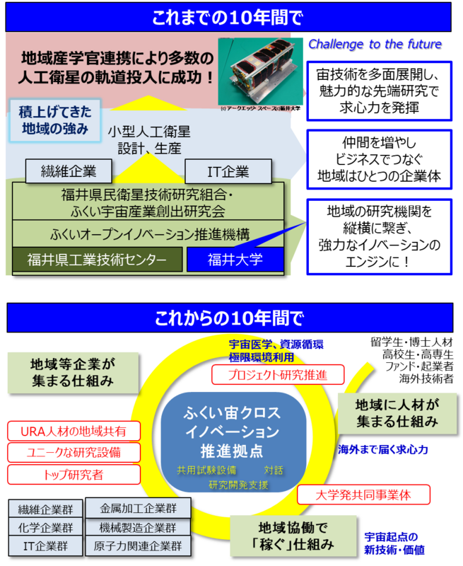 こうした環境変化を踏まえ、福井大学は今回の採択を契機に、これまで築いてきた地域との連携をさらに発展させ、「宇宙関連技術」と「地域の産業基盤技術」を融合することで、地域に人材や企業が集積し、地域全体で“稼ぐ”仕組みを構築する「宙(そら)を起点とした新たな産業価値の創出と地域経済の持続的成長」に挑戦します。