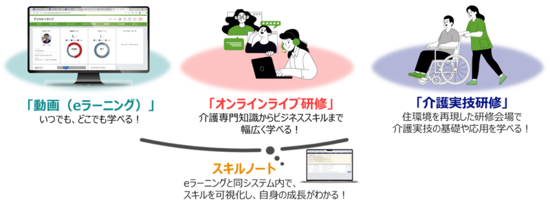 『スキル ドライブ』は、職員のスキルを可視化するアセスメントツール「スキルノート」に加え、「動画研修(eラーニング)」「オンラインライブ研修」「介護実技研修」の3つのアプローチを連動させた、介護に特化した人材育成サービスです。「知識→理解→実践」までを段階的にサポートすることで、知識や技術の習得を促します。育成における多様な課題を総合的に支援し、継続的に成長できる学習環境を提供します。これら4つのサービスを、1事業所あたり年間138,000円(税込 151,800円)で全て利用することが可能です。