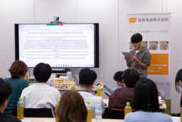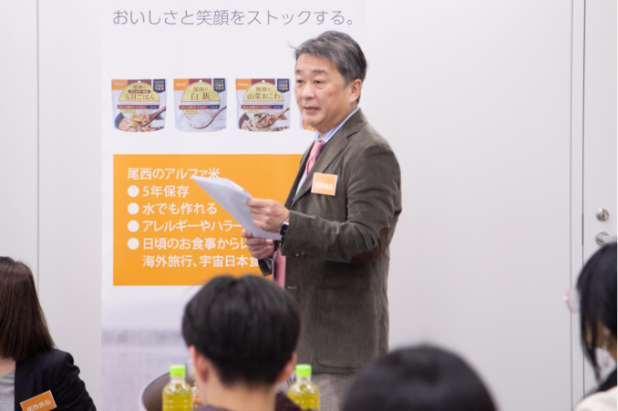 尾西食品株式会社経営企画部担当部長 雜部譲より、1935年創業、90年の歴史を持つ当社の取り組みをご紹介しました。「おいしさと笑顔をストックする」のタグラインのもと、非常食を通じた「誰ひとり取り残さない食の提供」という企業理念を共有しました。