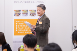 多文化・多宗教対応への取り組み: ハラール認証商品など、多様な文化・宗教に対応した商品開発について説明。工場映像を通じて、アレルギー対応商品(特定原材料等28品目不使用)の製造工程も紹介しました。「食は人々を分断するのではなく、つなぐものであるべき」というグローバル時代の新しい防災のあり方についても話しました。