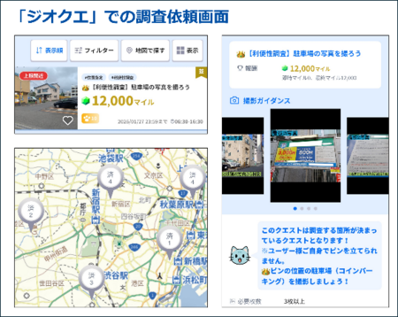 ジオテクノロジーズが運営するポイ活アプリ「ジオクエ」のユーザーを通じて現地の画像、位置情報を収集するサービスです。企業や自治体の調査ニーズに対して、現地に行かずに最新の情報を収集できるため、保守点検の効率化に効果的です。