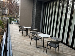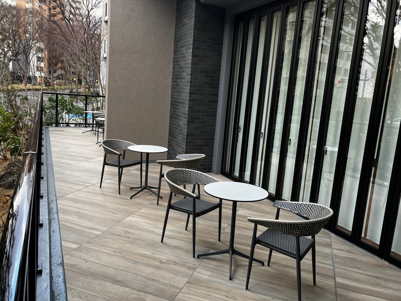 「青葉通り」に面したテラスで、散歩の際にペットと休憩できるテラスです。気候の良い時期は、ペットとともに読書や団らんを楽しむこともできます。なお、賃貸マンションの一部フロアはペット可としました。