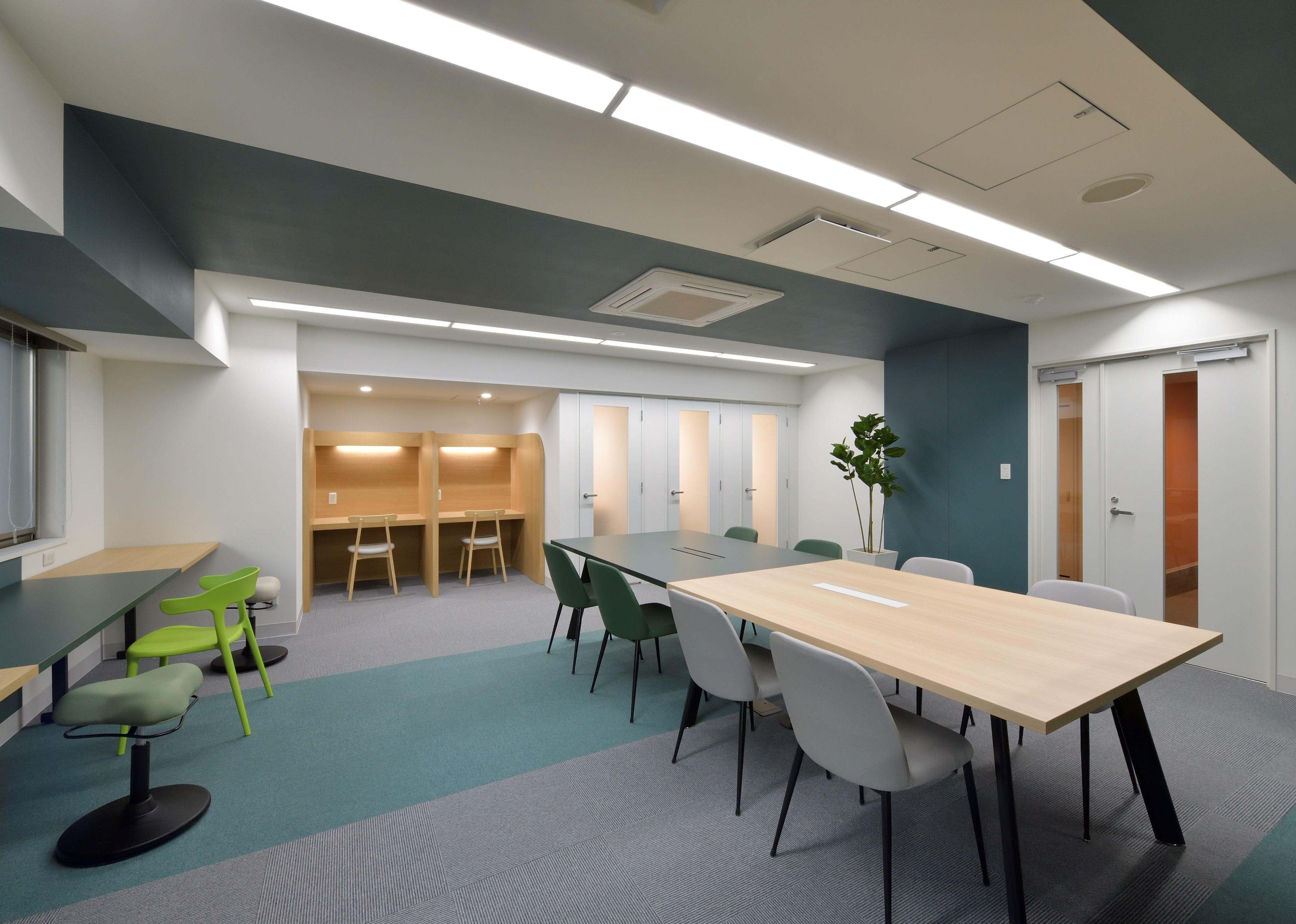 落ち着いて作業ができるワークスペースをエントランス横に設置。窓に面した明るいカウンター席(5席)とオンラインミーティングなどにも対応可能な個室(3室、有料・予約制)を設けました。