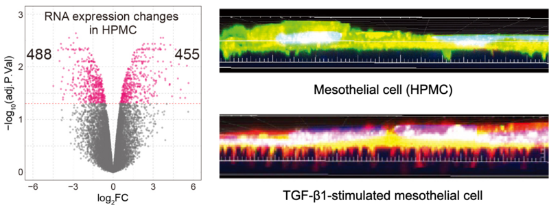 図7. 卵巣癌細胞とのスフェロイド形成を通して中皮細胞は遺伝子発現を劇的に変化させる(左図)。主な経路であるTGF-β1刺激により、浸潤に関与するスパイク状のinvadopodiaと呼ばれる構造が増加する(右図)。