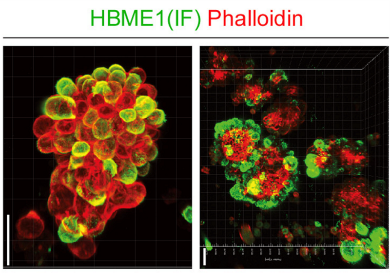 図4. 卵巣癌-中皮細胞スフェロイドの代表的な図。緑色は中皮細胞を標識するHBME1染色陽性の中皮細胞、赤色は癌細胞スフェロイドの全体像を示す染色。卵巣癌スフェロイドは、卵巣癌単独ではなく、中皮細胞が含まれていることを多光子顕微鏡という高度な顕微鏡で確認した。スケールバー:50μm