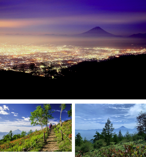 山頂や登山道に絶景スポットがあり、雄大な富士山と甲府盆地の街並みを望むことができます。
