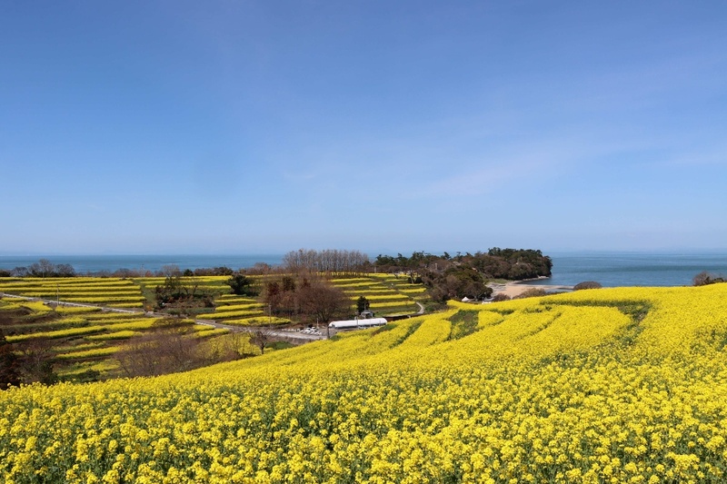 昼は、青い海と黄色い菜の花が織りなす絶景。