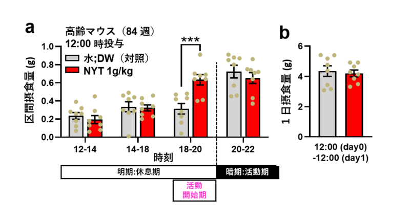図1. 高齢マウスへ人参養栄湯(NYT)を12:00時に投与すると、18-20時選択的に摂食量を増加し(a)、 1日摂食量に影響しない(b) 【活動開始期食欲/摂食促進】。