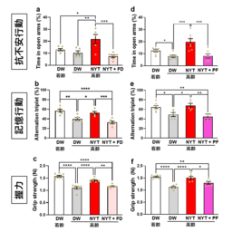 図2. 人参養栄湯(NYT)の3日間投与は、高齢マウスで低下した抗不安行動(a,d) 、記憶行動(b,e) 、握力(c,f)を回復する。それらの効果は3日間の18-20 時の餌を除く(FD; a-c) 、または、18-20 時の摂餌量を対照群と合わせたペアー摂食(PF, d-f)により遮断される。