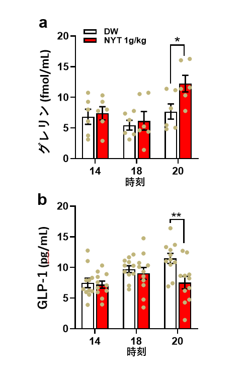 図3. NYT を12:00時に投与すると、20時の血中グレリンは上昇し(a)、GLP-1は低下する(b)。