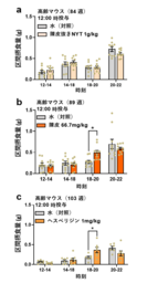 図4. 高齢マウスへの (a)陳皮抜きNYT投与は効果がなく、 (b)陳皮および(c)ヘスペリジン投与は18-20 時選択的に摂食促進を起す。