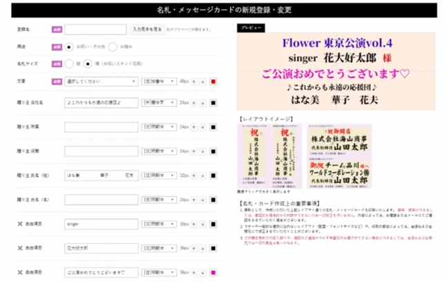 本機能の最大の特徴は、従来のフラワーギフト業界にはなかった「作成自由度の圧倒的な高さ」です。文字サイズ・文字色・文字配置をミリ単位で自由に調整できるため、よりお客様の理想系に近い名札作成を叶えます。また、定型フォーマットでは対応が難しかった「お届け先様のコーポレートカラーで印字したい」「連名のバランスを細かく整えたい」「差出人名はあえて控えめに小さく書きたい」といった、法人贈答ならではの細かなこだわりやニーズにも柔軟に対応します。複数フォントからの選択も可能で、自社のブランドイメージを損なうことなく、品格のある立札をセルフ操作で即座に作成いただけます。