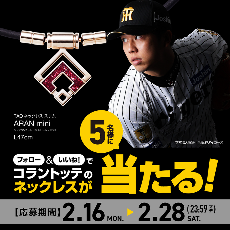 契約を記念して才木浩人選手が着用しているTAO ネックレス スリム ARAN mini【シャンパンゴールド】ルビーレッドラメ LサイズがあたるSNSキャンペーンを実施いたします。期間中、コラントッテ公式XもしくはInstagramのアカウントをフォローし、キャンペーン内容をフォロー&「いいね」でキャンペーンに参加できます。詳細はコラントッテ公式X及び公式Instagramにて案内いたします。