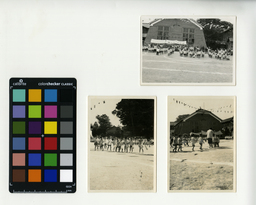 講堂は、当時の地域において最大の建築物で、様々な行事の場にもなりました。特に、県内四地区の中でも特に広い校庭を活かして、毎年10月に連合運動会が行われるなど、学校は地域住民の交流と活動の拠点でもありました。そのため、校庭は、運動会の際の資料写真と証言をもとに象徴的な点景として再現しました。