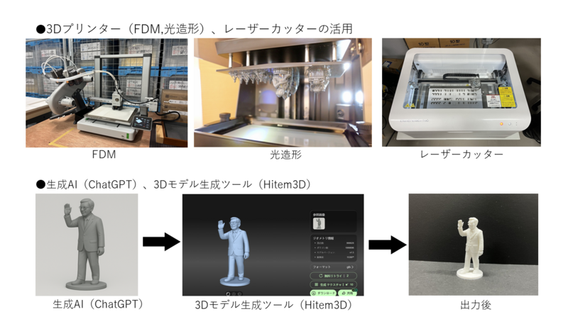 制作にあたっては、レーザーカッターや3Dプリンターといった最新のデジタルファブリケーション技術を積極的に活用しました。「この場所ではこんな事をした」といった卒業生の語りをもとに、当時の活動に即した人物モデルを生成AIによって具現化し、3Dプリンターで出力することで、オリジナルの点景を作成しました。