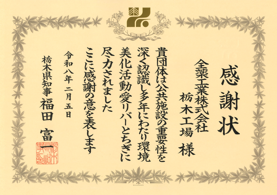 「愛リバーとちぎ」、「愛ロードとちぎ」は、河川環境の維持向上や安全で快適な道路環境を整備するとともに、道路や川を愛する心を育むために行っている環境美化活動です。全薬工業栃木工場は栃木県及び大田原市から、河川・道路の環境美化に取り組む「愛リバーとちぎ」「愛ロードとちぎ」の実施団体に認定されています。栃木工場の全従業員は日頃から協力し合い、積極的に2つの環境美化活動を行っています。この度は「愛リバーとちぎ」を15年以上継続している点を評価いただき、知事感謝状を贈呈されました。