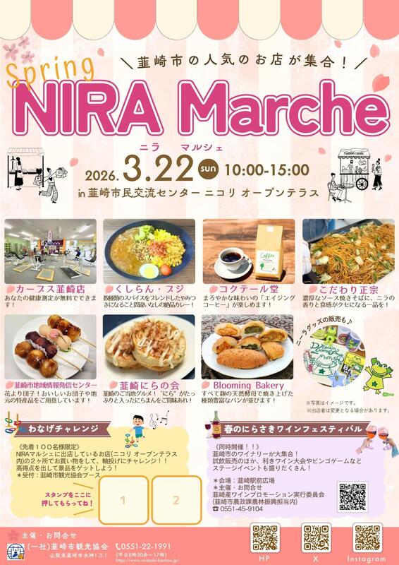 韮崎市の魅力を味わい尽くす一日、「NIRAマルシェ」と「春のにらさきワインフェスティバル」を、令和8年3月22日(日)に同時開催します。