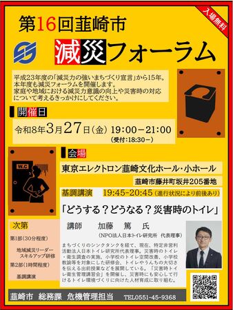 今回のフォーラムでは、NPO法人減災ネットやまなしの協力による「地域減災リーダースキルアップ研修」を実施するとともに、基調講演として、災害時に重要となる「トイレ・衛生」をテーマにした講演を行います。