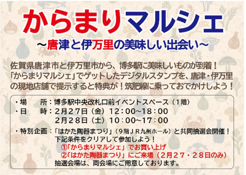 博多駅中央改札口前イベントスペースにて唐津市・伊万里市の12事業者が出店するマルシェが開催されます。からまりマルシェとはかた陶器まつりの両会場でデジタルスタンプ(NFT)を取得された方先着100名様限定でガラポン抽選会を開催します!