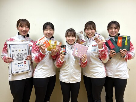 「ニッポンの食」を手に笑顔のカーリングジュニア日本代表選手の皆さん (写真提供:日本カーリング協会)