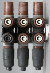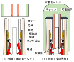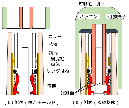 | MDS開放時の点検 ・固定モールド基礎部の樹脂バンド(ゴム)に損傷・変形等がないか確認する ・可動モールド内部のパッキンや内壁に異常がないか確認する ・固定モールド外壁や可動モールド内壁に水滴や埃等の付着がないか確認する ・固定モールド外壁に微かな焼損跡やヒビ模様がある場合は、沿面地絡の初期段階である可能性が高いため、更新を推奨する |