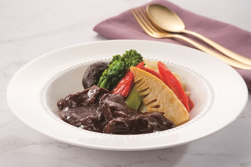 帝国ホテル伝統のデミグラスソースでじっくり煮込んだビーフシチューに、万願寺とうがらしや九条ねぎ、金時人参などの京都産野菜をそれぞれの味わいが引き立つよう適した方法で調理し、ヌードルを添えてご提供いたします。