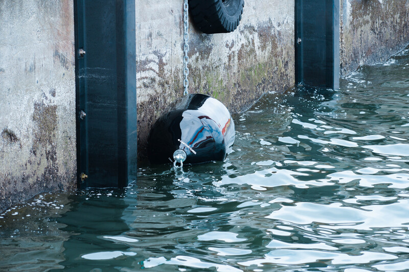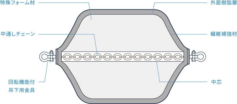本製品は、船舶が岸壁などに接岸・係留する際に生じる衝撃を吸収・緩和し、船舶および港湾設備を保護するために用いられる防舷材です。防舷材には、岸壁に固定して使用する「ゴム式」と、水に浮かべて使用する「浮体式」があり、浮体式には「空気式」と「フォーム式」の2種類があります。