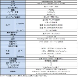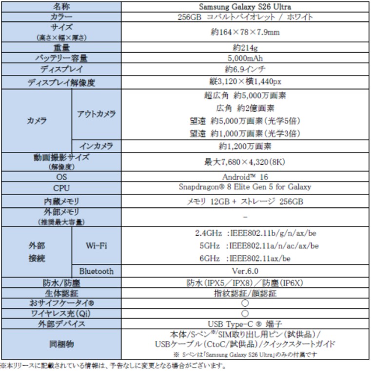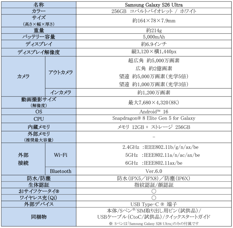 <主な仕様:「Samsung Galaxy S26 Ultra」>