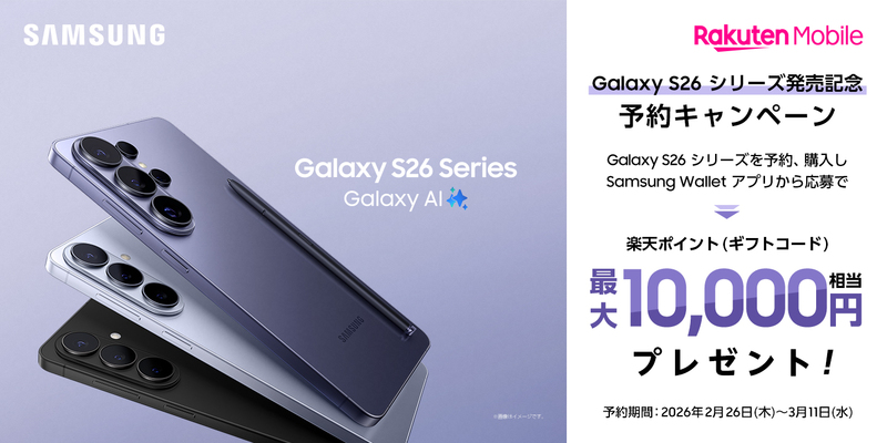 対象期間中に楽天モバイル公式サイト、楽天モバイル公式 楽天市場店にて「Samsung Galaxy S26」、「Samsung Galaxy S26+」、「Samsung Galaxy S26 Ultra」を予約購入いただきSamsung Walletアプリからご応募いただくと楽天ポイント(ギフトコード)をプレゼントいたします。