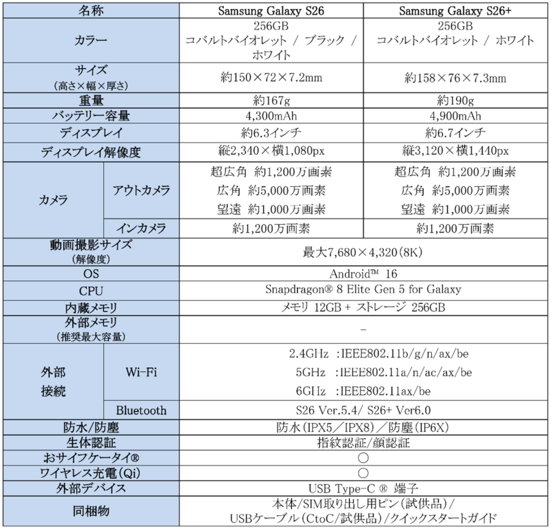 <主な仕様:「Samsung Galaxy S26」、「Samsung Galaxy S26+」>