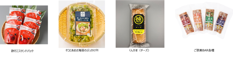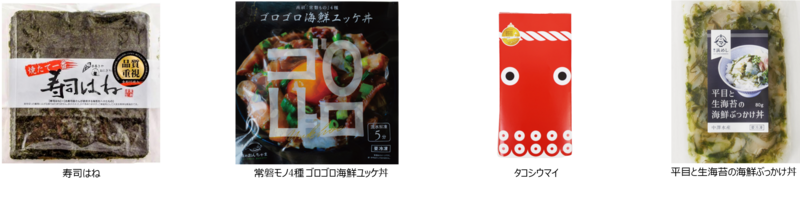 l カネセン水産(味付きつまみたこ各種、タコとあおさ海苔の海鮮ぶっかけ丼)