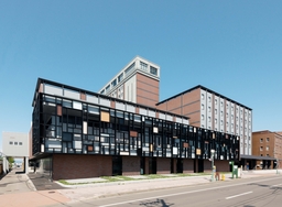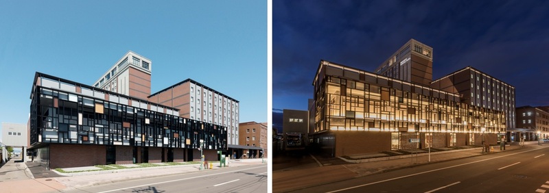 JR函館駅前に隣接する函館朝市とベイエリアを結ぶ開港通りにある函館の老舗ホテルであり,平成30年度の耐震補強・建替工事によりリニューアルされた。正面玄関は広い間口を確保しつつ,軒のラインを低く抑えることで,大規模建築物でありながらも圧迫感を与えず,周囲との調和を図っている。ファサードは低層部に函館を象徴するレンガ風タイルを採用し,レトロ感を演出するとともに,上層部は幾何学模様の格子を組み合わせた近代的なデザインが印象的であり,開港通りのランドマーク的存在となっている。
