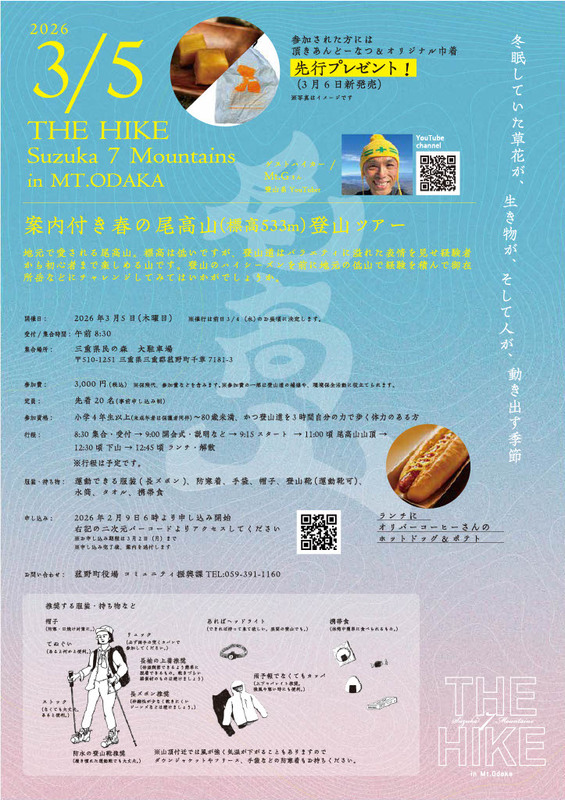三重県菰野町では、案内付き春の登山ツアー「THE HIKE Suzuka 7 Mountains in MT. ODAKA(尾高山)」を、2026年3月5日(木)に開催します。